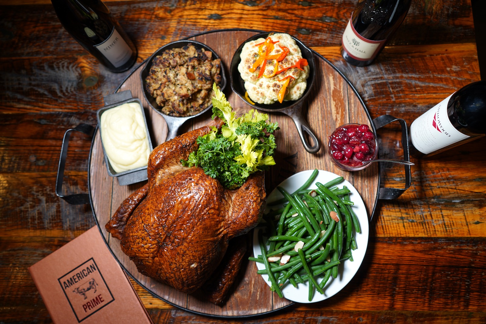 Our Signature Smoked Turkey, ready with gravy, cranberry sauce, stuffing, mashed potatoes, and green beans.
